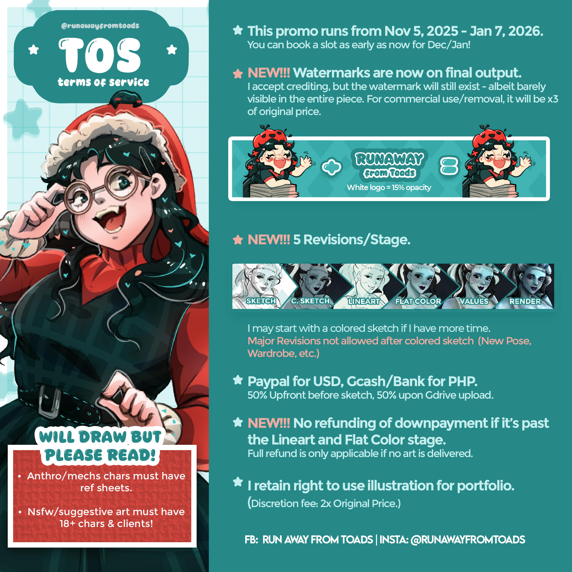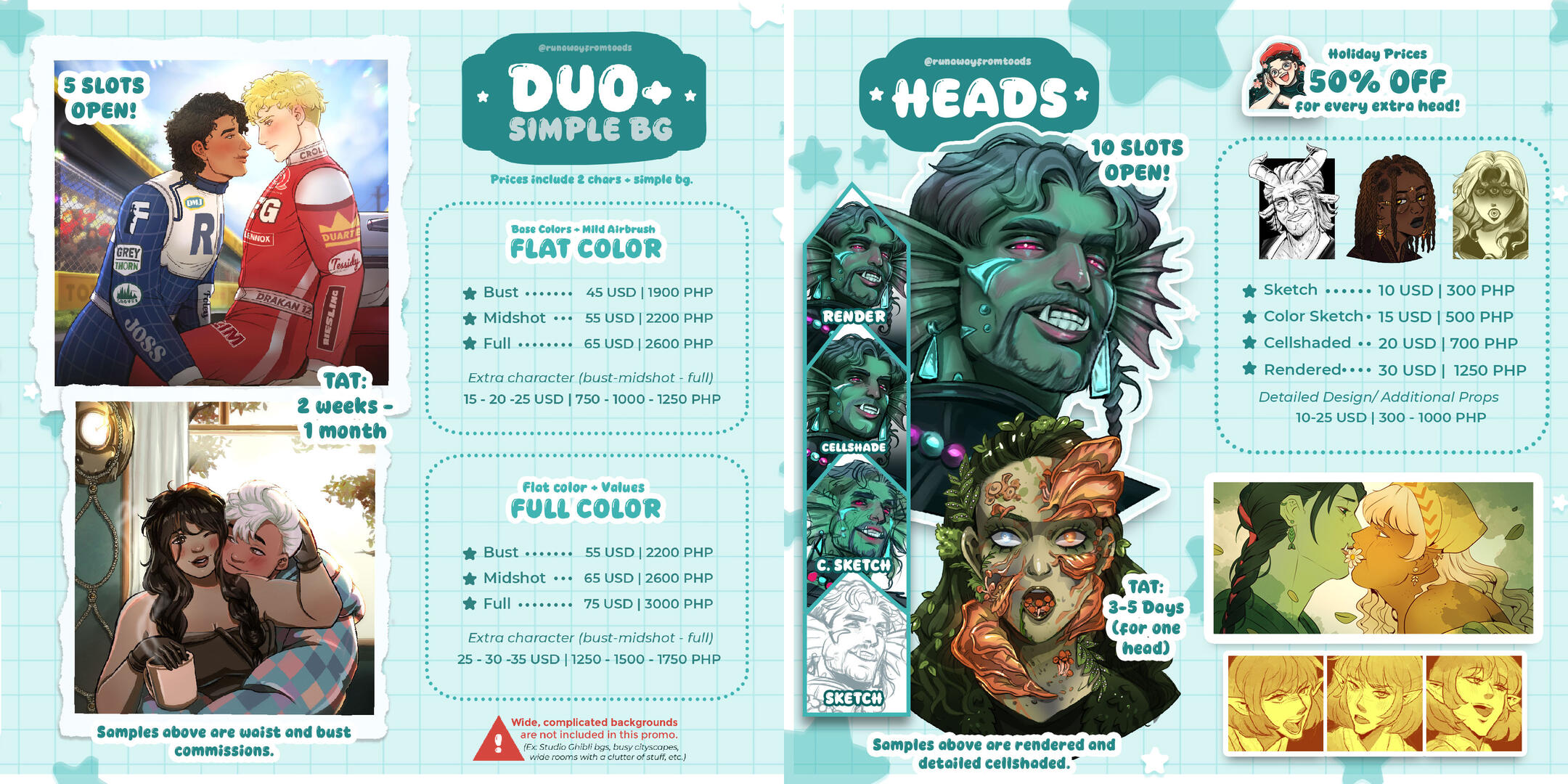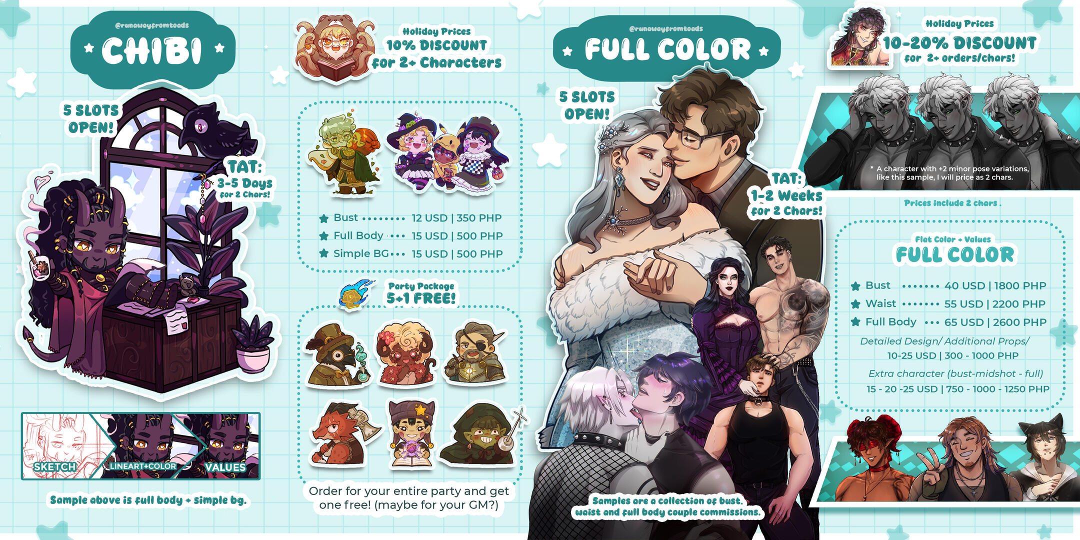 Got characters, scenes, or book covers you'd like drawn? I'm down!Paypal for USD | Gcash/Bank Transfer for PHP.